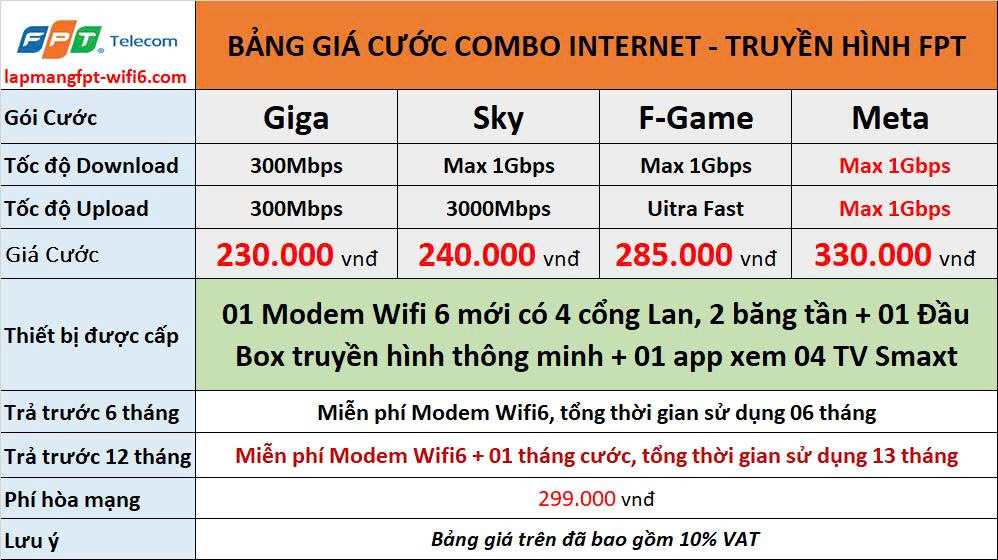 - Trả trước 12 tháng: Miễn phí lắp đặt + tặng miễn phí tháng 13 và thiết bị chuyên dùng
